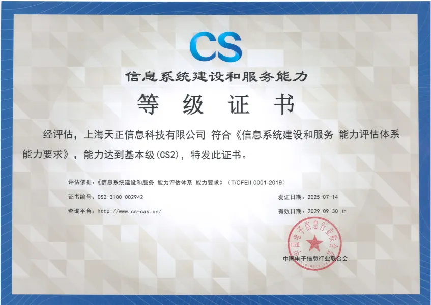 祝賀上海天正信息榮獲CS二級(jí)證書(shū)!